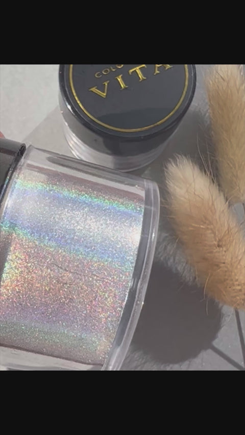 Silver MagicPigment provides 5 grams of holographic pigment per jar. This versatile product is suitable for various craft applications, including watercolor and resin artwork.